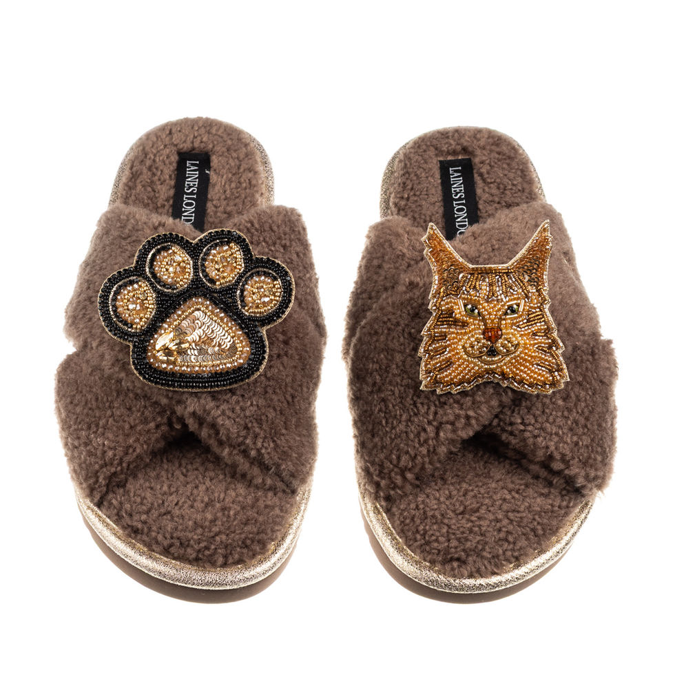 Boucle Slippers With Paw & Ginger Maine Coon Cat Brooches