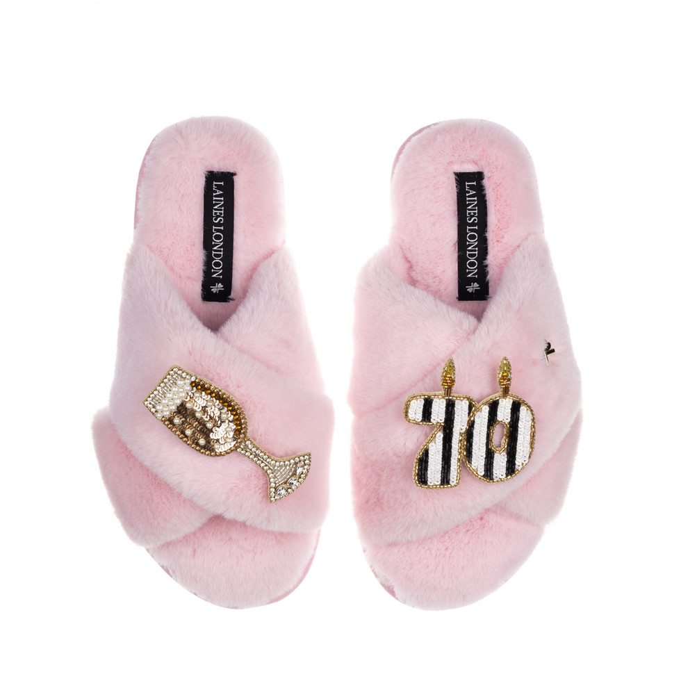 Classic Laines Slippers With Stripe 70th Birthday & Glass Of Champagne Brooches
