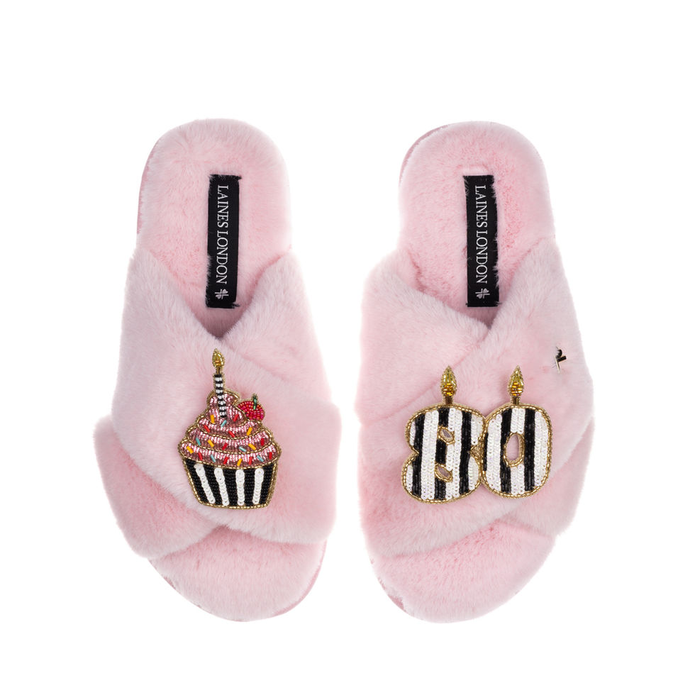 Classic Laines Slippers With Stripe 80th Birthday & Cake Brooches