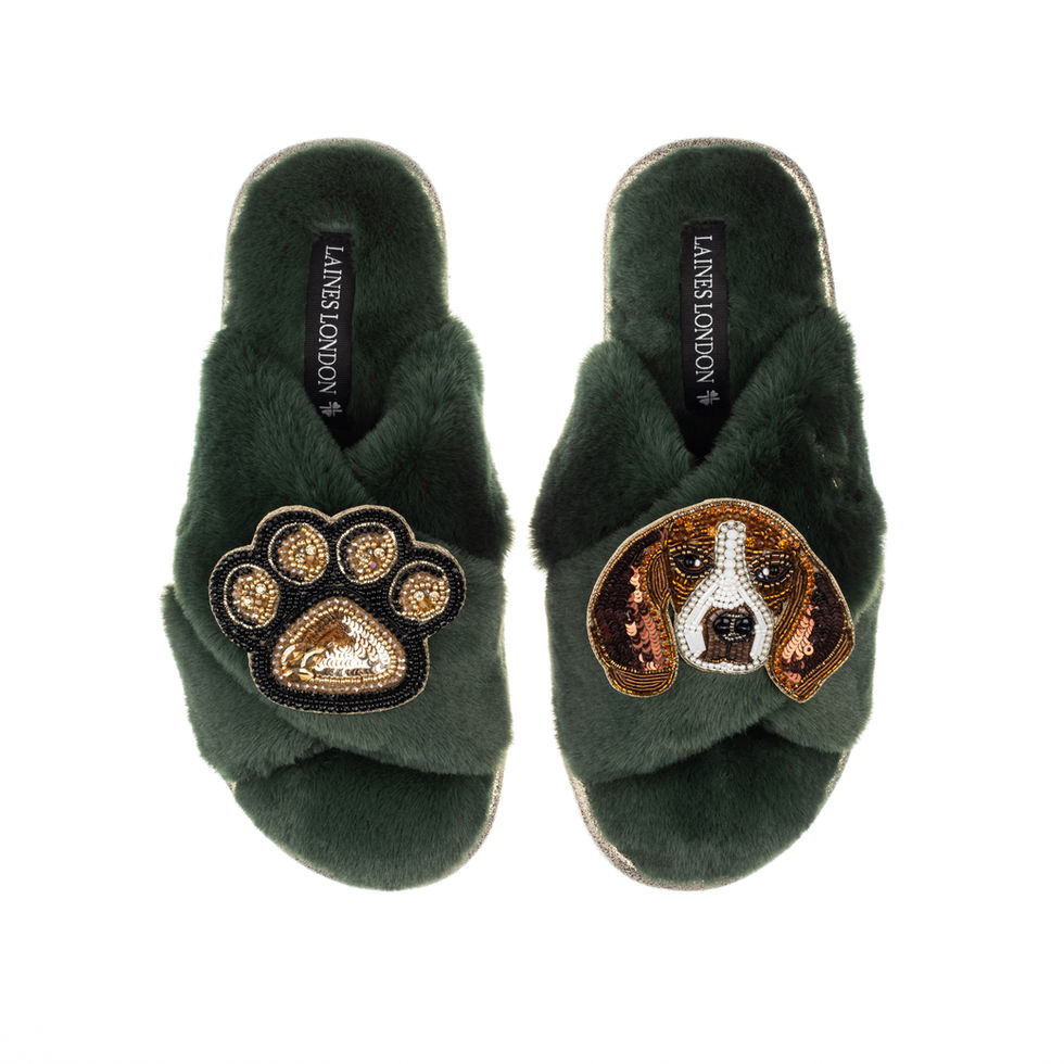 Our Classic Laines Slippers with Beagle & Paw Brooches are the perfect combination of style and comfort.