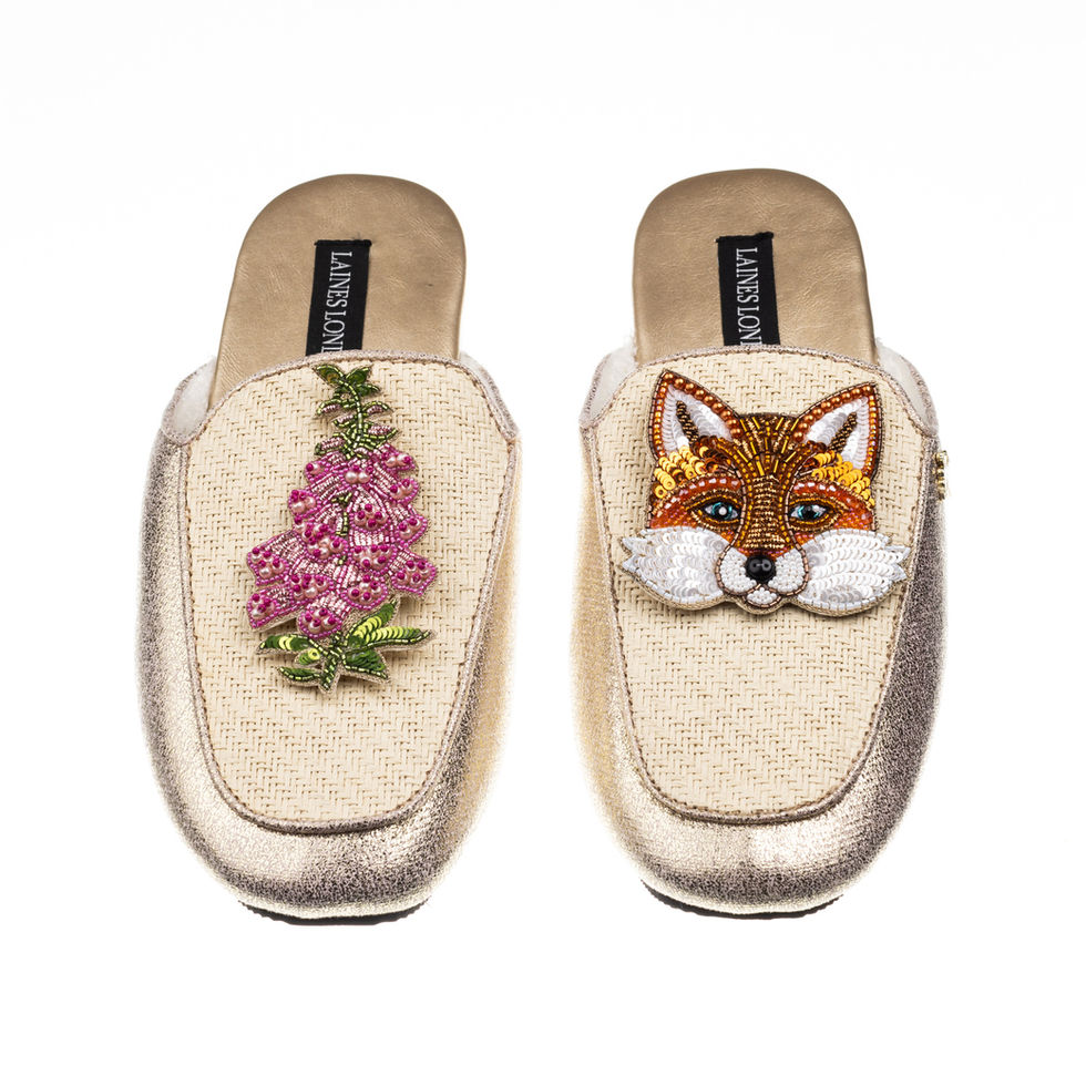 Classic Mules With Pink Foxglove Flowers & Fox Brooches