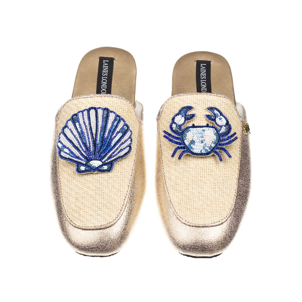 Classic Mules With With Mediterranean Blue Shell & Crab Brooches