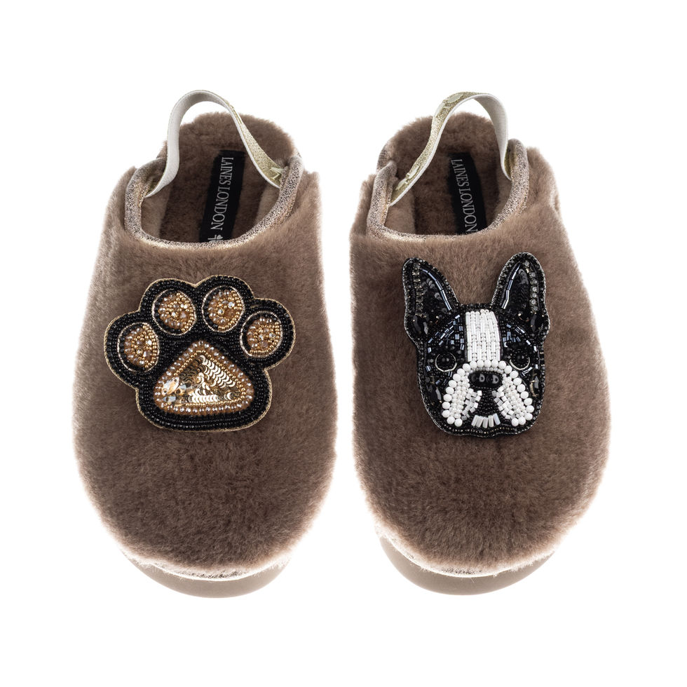 Flatform Cloud Slippers With Buddy The Boston Terrier & Paw Brooches