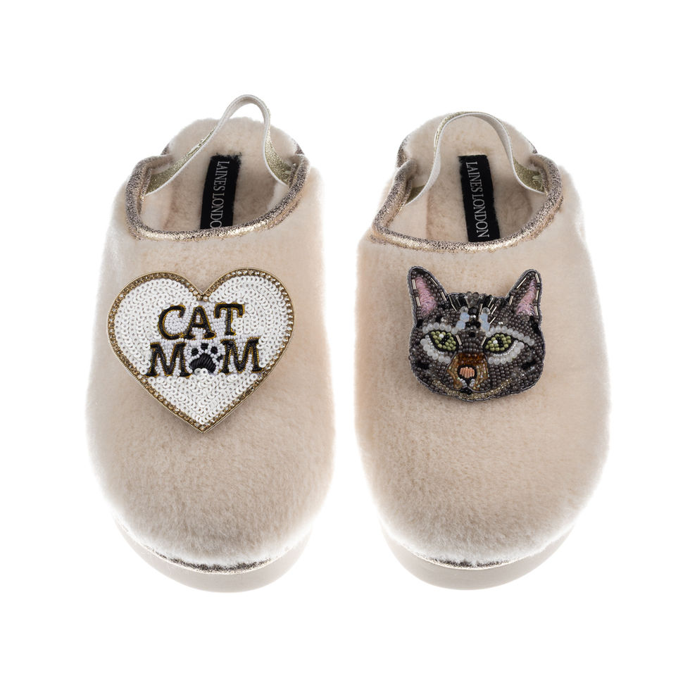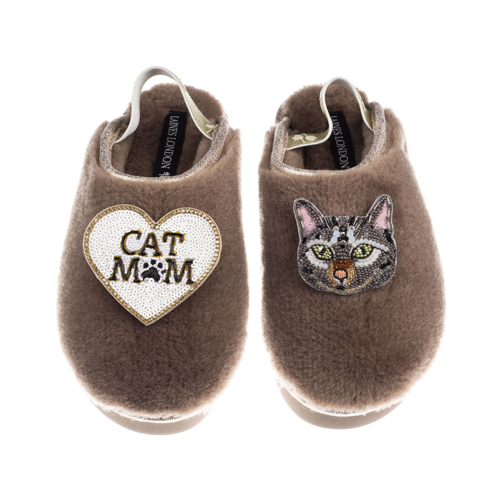 Flatform Cloud Slippers With Grey Pebbles Cat & Cat Mum / Mom Brooches