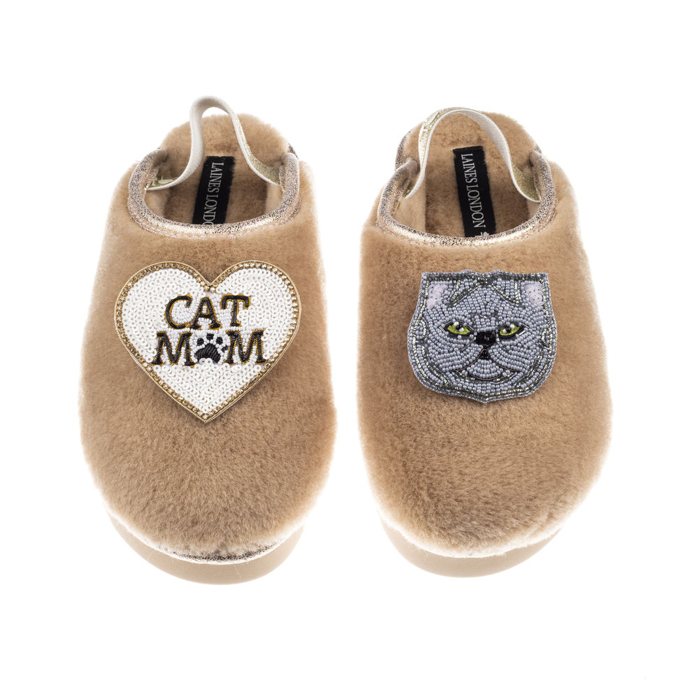 Flatform Cloud Slippers With Grey Persian Cat & Cat Mum / Mom Brooches