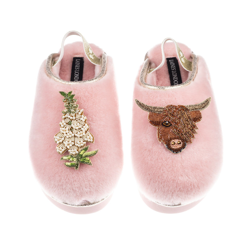 Flatform Cloud Slippers With Highland Cow & White Foxglove Flower Brooches
