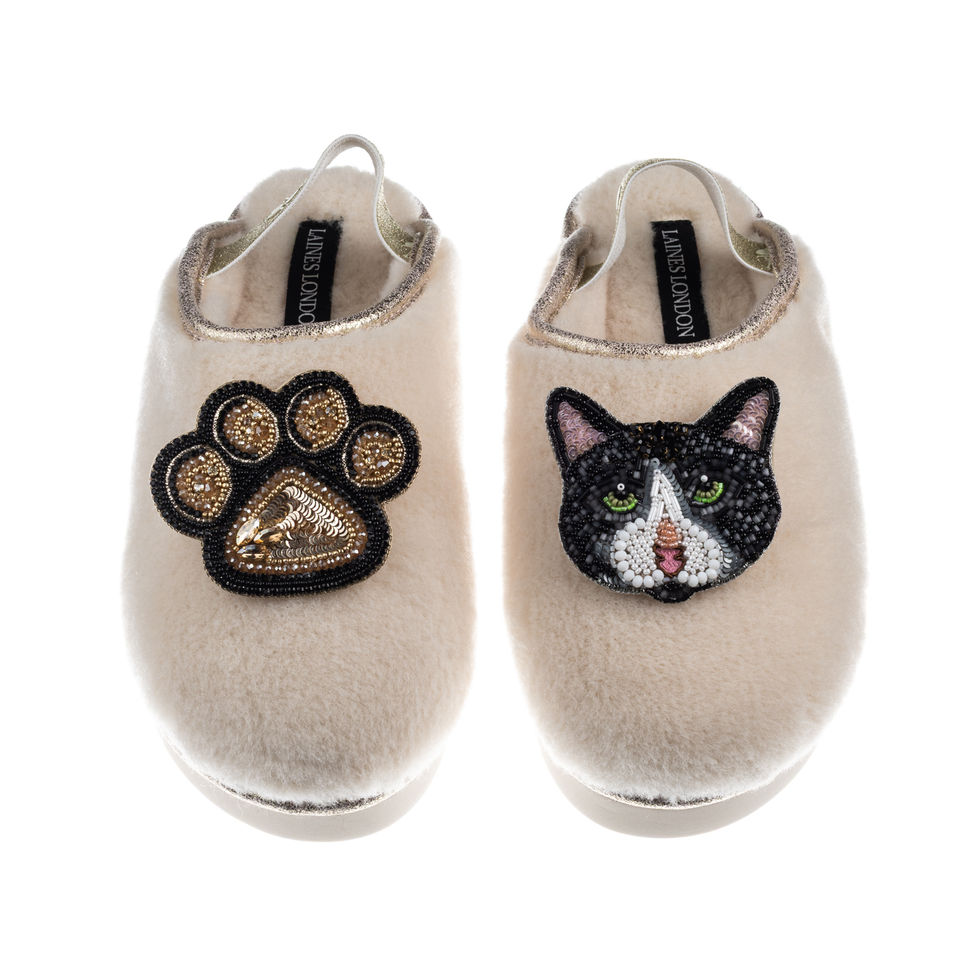 Flatform Cloud Slippers With Oreo Black & White Cat & Paw Brooches