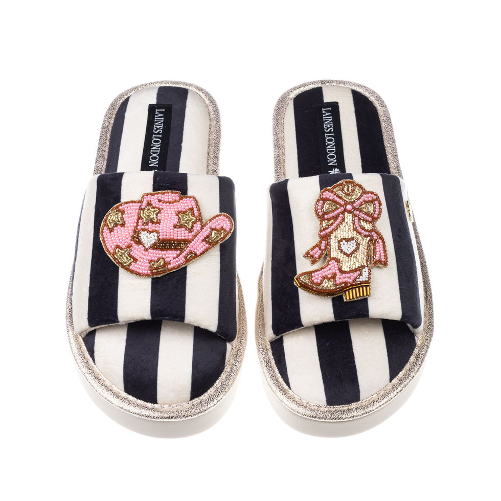 Flatform Stripe Open Toe Slippers With Cowgirl Hat & Cowgirl Boots Brooches