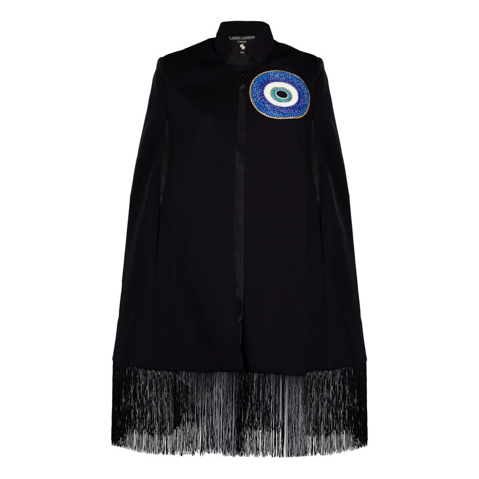 Laines Couture Fringed Tassel Cape With Embellished Evil Eye