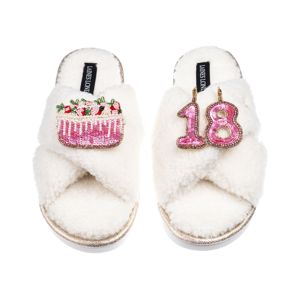 Laines Neutral Boucle Slippers With 18TH Birthday & Cake Brooches