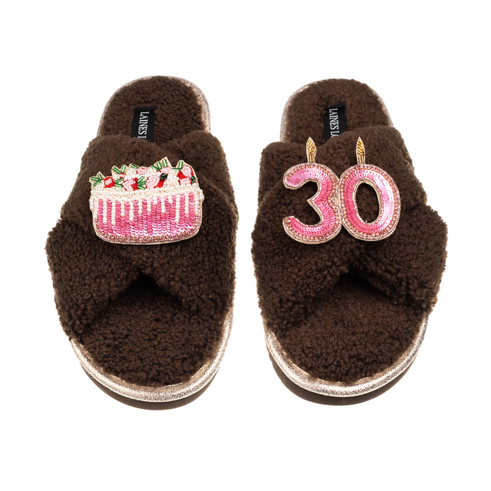 Laines Neutral Boucle Slippers With 30TH Birthday & Cake Brooches