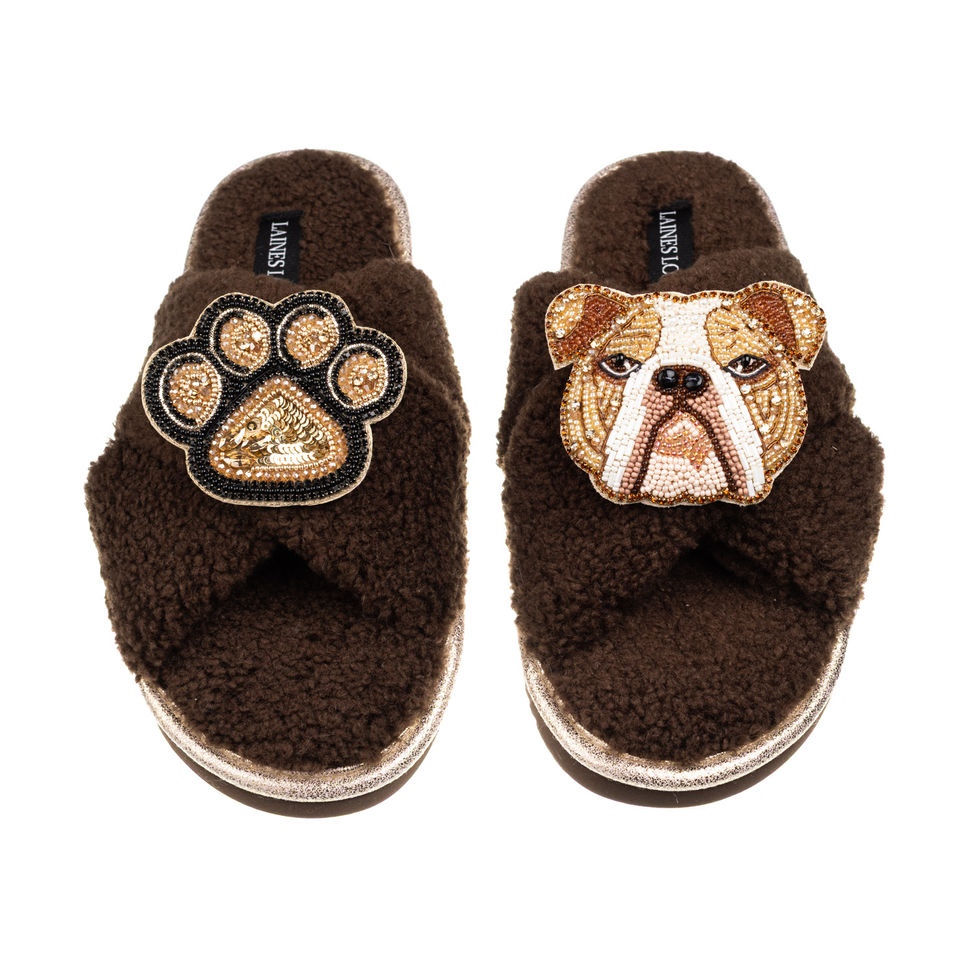 Laines Neutral Boucle Slippers With Mr Beefy The Bulldog & Paw Brooches