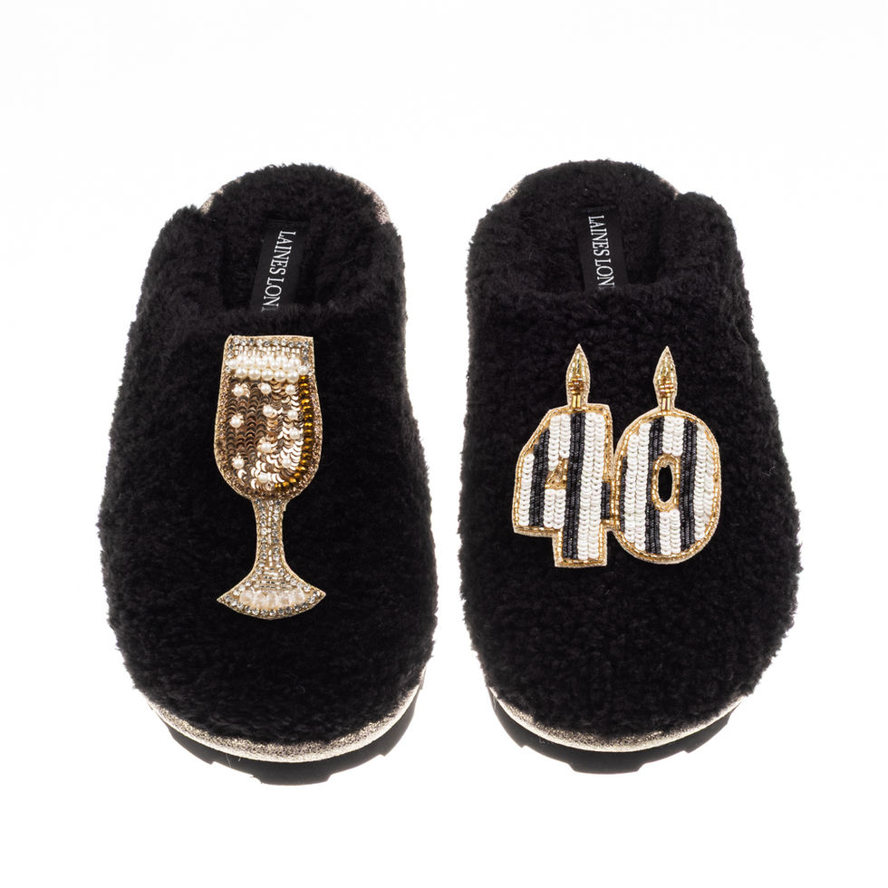 Teddy Closed Toe Slippers With Stripe 40th Birthday & Champagne Glass Brooches