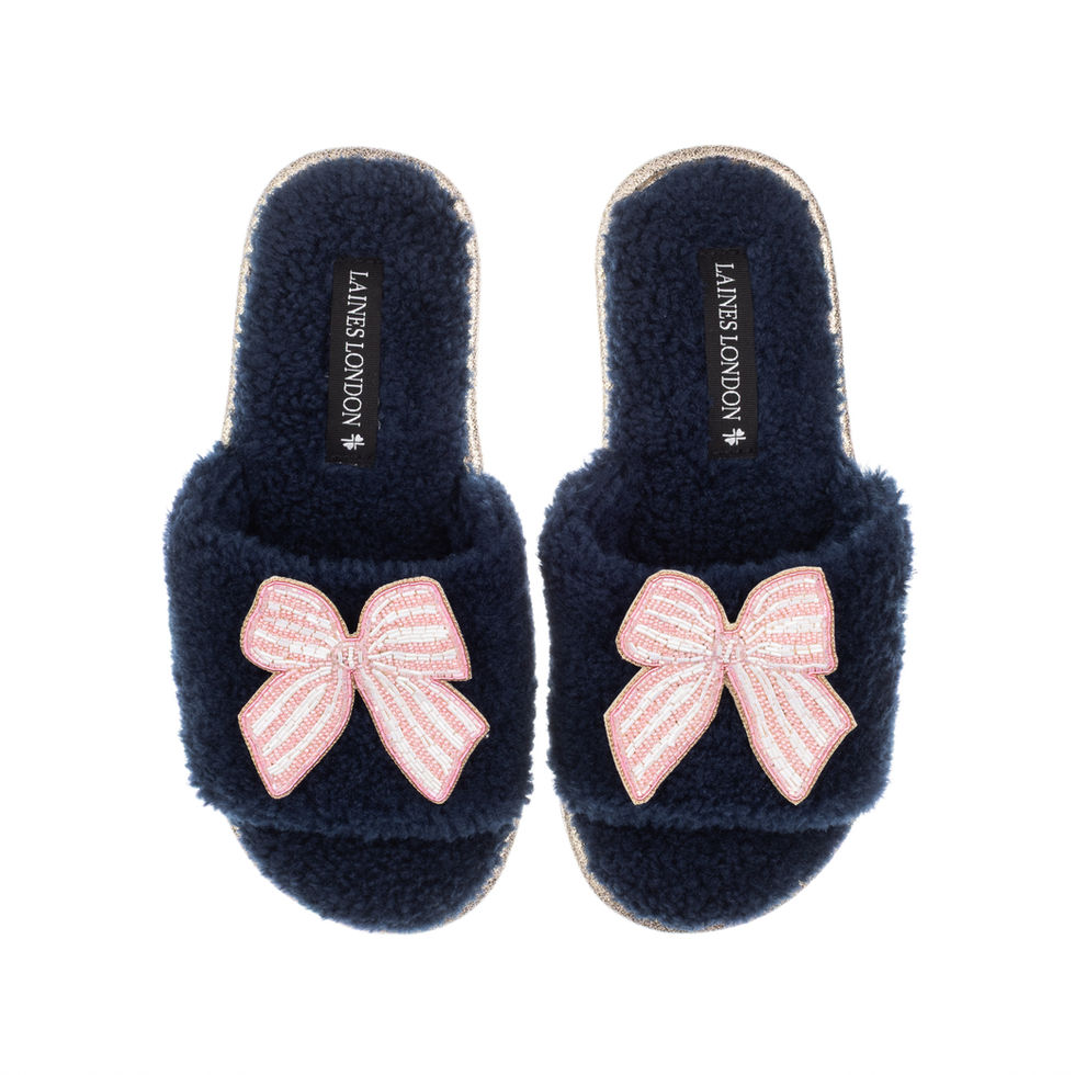 Teddy Towelling Slipper Sliders With Pink Stripe Bow Brooches